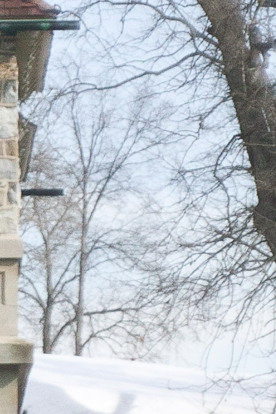 Lens at infinity, F8, 1/20000s. Grings Mill, Reading, PA. Left, 100% crop showing unfocused trees, right.