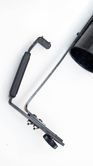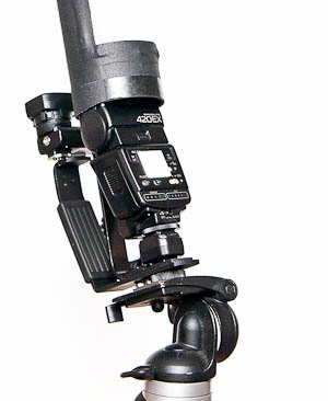 A 3/4" wide by 1/8" thick piece of aluminum flat stock runs the entire backside for support, and is bent and bolted to a flash gun handle. The speedlight is attached to the camera screw and floats into the bottom of the tube. The weight of the device is supported by the flat stock.