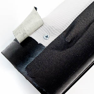 A white medical grade compression stocking is then carefully pulled over the tube. Screws are placed every four inches along the edge of the window to anchor the material. The stocking is then cut outside the screws and black gaffers tape is run over the seam.