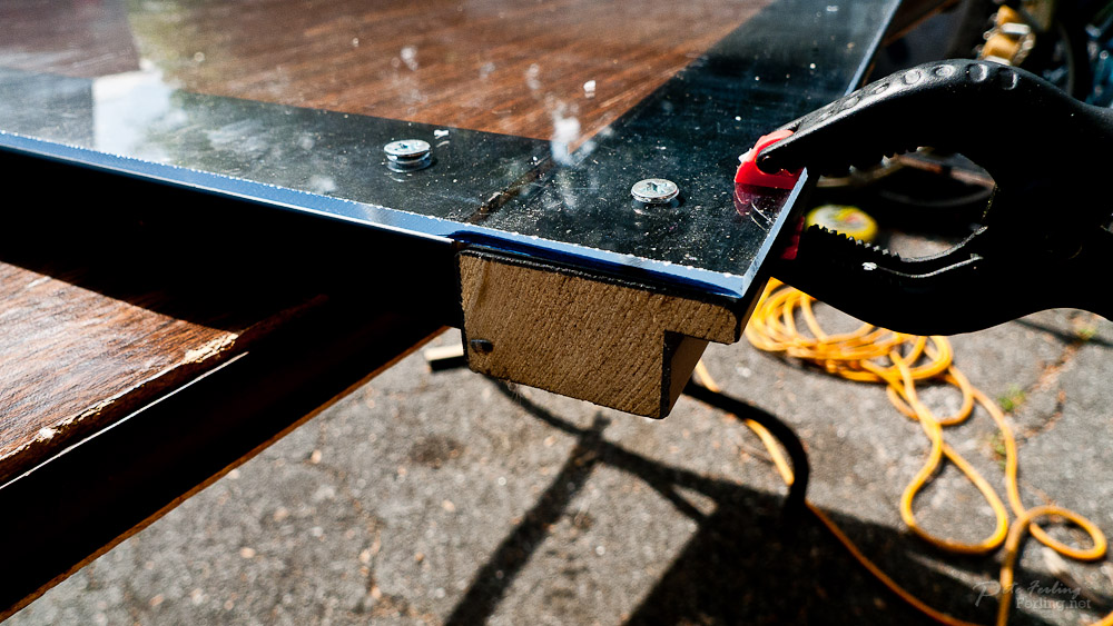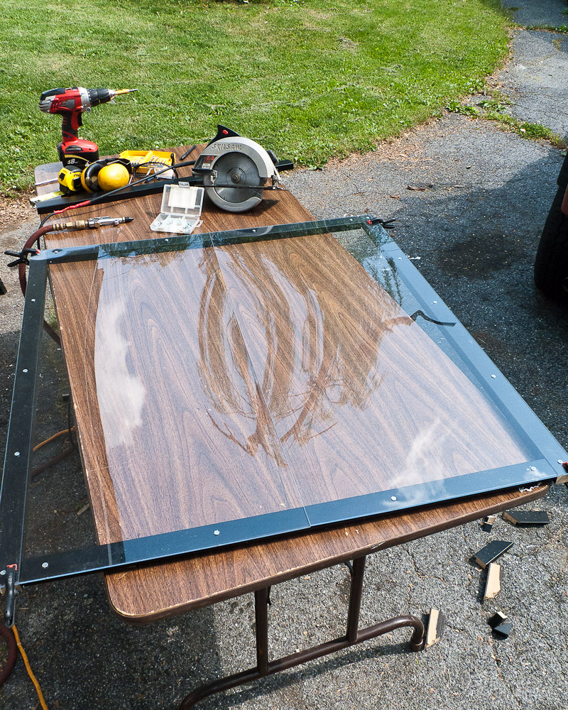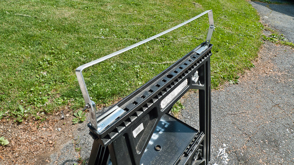 Essentially, it's two sheets of Plexiglas with a wooden frame that is clamped to a simple truss on light stands and a modified, plastic sawhorse.