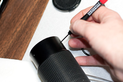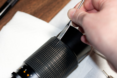 Using a spoon (or dull flat metal object), I loosen the focus grip.