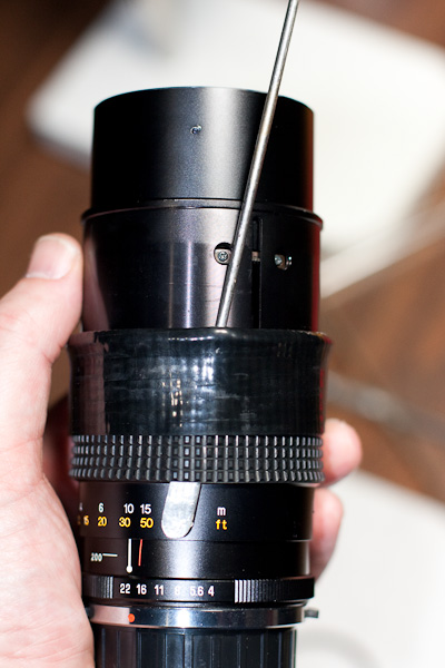 Carefully rolling the grip back I expose the front element cover retaining screws.