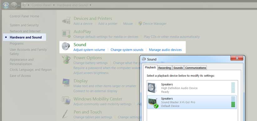 If your PC fails to autoselect the device, you can manually select the Sound Blaster via the Control Panel, (see below). Select "Hardward and Sound", then select "Manage audio devices". In both the Playback and Recording Tabs, right click on the Sound Blaster X-Fi Go! Pro Icon and set it as the default device.